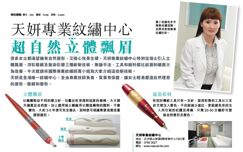 很多女士都渴望拥有自然眉形,又担心效果生硬。天妍专业纹绣中心特别从瑞士引入立体飘眉, 浮彩眼线及旋染彩唇三种崭新技术,无论手法,工具和颜料都比纹眉和绣眉大为改善,今次就请来国际专业纹绣师贾小姐为大家介绍这些新技术。 天妍是全港唯一纹绣中心,全由专业技师负责,质素有保证,让女士轻易塑造自然理想的眉形,眼线和唇形。