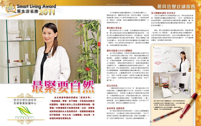 自古与眉有关的词语如 「 眉清目秀 」,「皓齿娥眉」等等,多不胜数 ,可见眉在容貌中的要性;偏偏大部分人天生眉形都有缺点,需要进一步修补造形才能臻至完美。以往,消费者 始终对纹眉的永久性效果却步,但随着纹绣技术的不断发展,半永久性「立体飘眉」的出现,令纹眉的专业性更胜往昔。今次荣膺最具信誉纹绣服务的「天妍专业纹中心亅,开业超过15年,属业界的佼佼者。对于是次获奖,天妍的技术总监贾小姐表示十分荣幸得到读者的支持、「这是对我们的一种肯定,我们会一如既往继续提供优质的纹服务,以答谢他们的支持。」