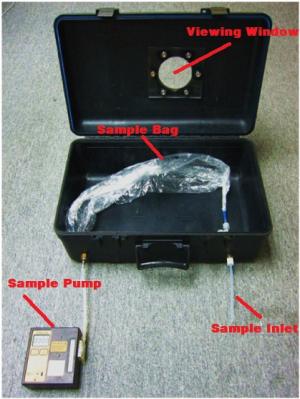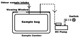 Odour samples are taken into Nalophan sampling bags loaded in a vacuum drum through clean Teflon tubing probes inserted into the stack at different points. The odour sample is collected using an odour sampling system as shown in Figure 1. A vacuum DC pump is connected to the sampling chamber as shown. A new and cleaned Nalophan bag is placed into the sampling chamber. Air is then pump out of the sampling chamber by a DC pump creating a vacuum inside the chamber. Sample is drawn into the bag by pressure difference between the inside and outside of the bag.